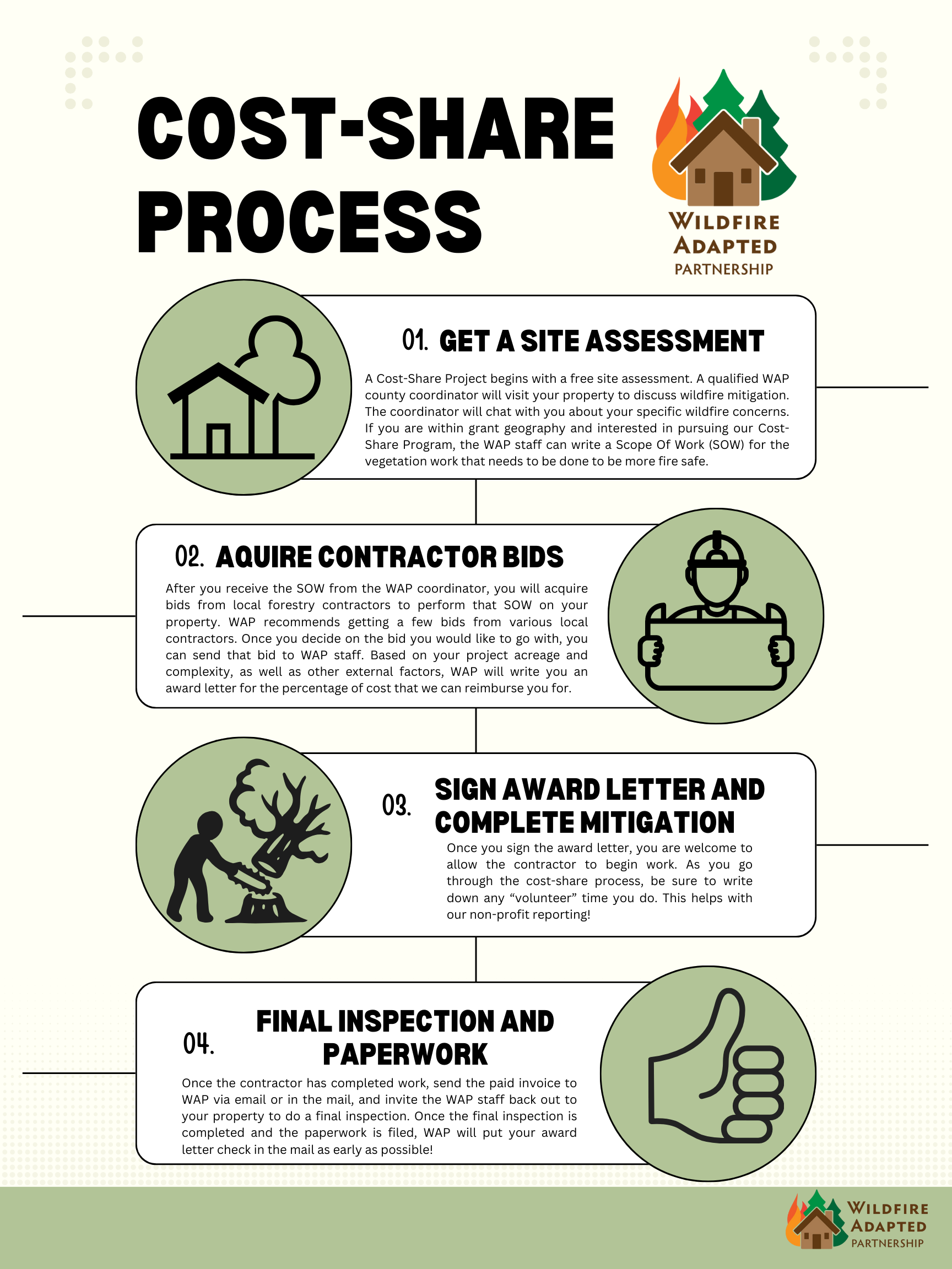 If you are a contractor and you are not on this list but want to be, fill out this application to be added. If you are a contractor and want to learn more about Wildfire Adapted Partnership’s Cost Share Program process, requirements, and expectations, please watch this video->>>>>