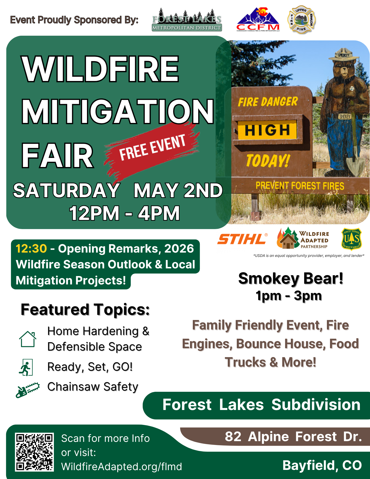 Come join us Saturday May 2nd for a FREE Wildfire Community Preparedness Day in the Forest Lakes subdivision! Visitors will learn about Wildfire Mitigation, Emergency Preparedness, how YOU can reduce your Wildfire Risk, & much more! Bring the entire family, as this is a family friendly event. Local food trucks will be available for food purchase.
